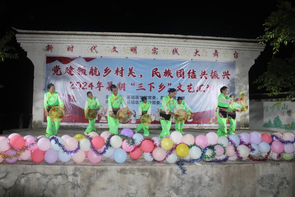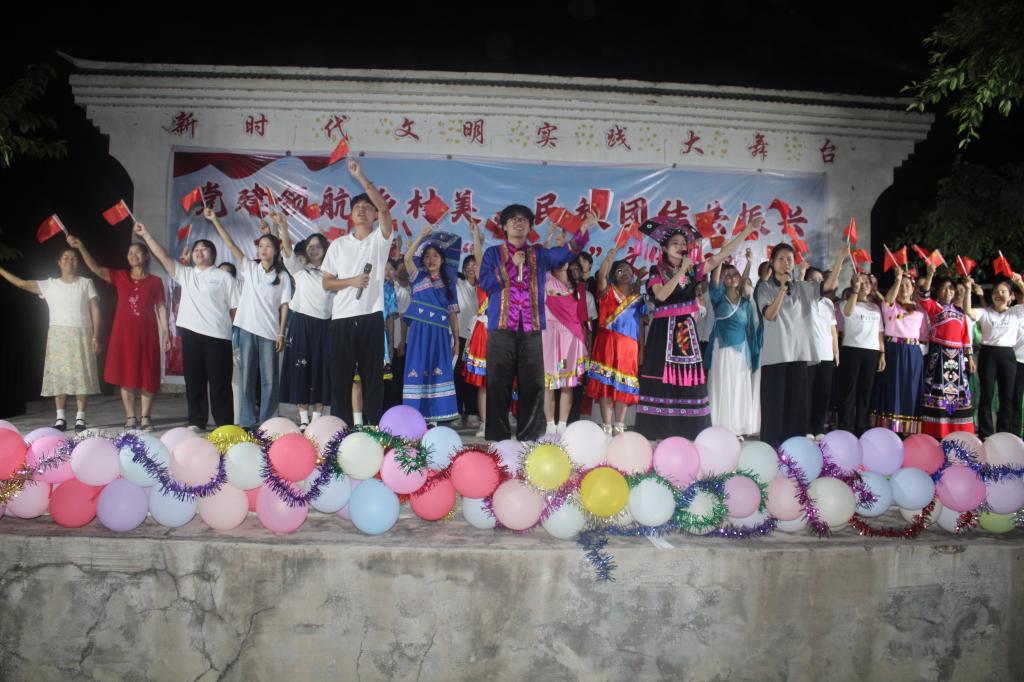 随着夜幕降临,一场融合传统与现代的民族团结文艺晚会盛情上演。实践团与村民携手,用柔美的舞蹈、悠扬的歌声、生动的情景剧,共同描绘了一幅民族团结、文化交融的动人画卷。