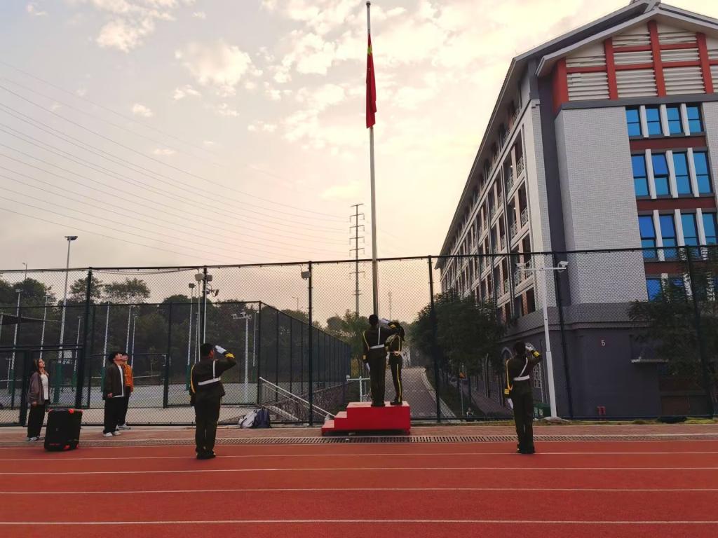 上午7:30,升旗仪式正式开始。随着慷慨激昂的《义勇军进行曲》响起,五星红旗在晨光中冉冉升起,迎风飘扬。升旗过程中,全体师生保持肃立,神情专注,齐声高唱国歌,激昂嘹亮的歌声在校园上空回荡,彰显出师生们对祖国的无限热爱与崇高敬意。整个场景庄重而神圣,充满了浓厚的爱国情怀。