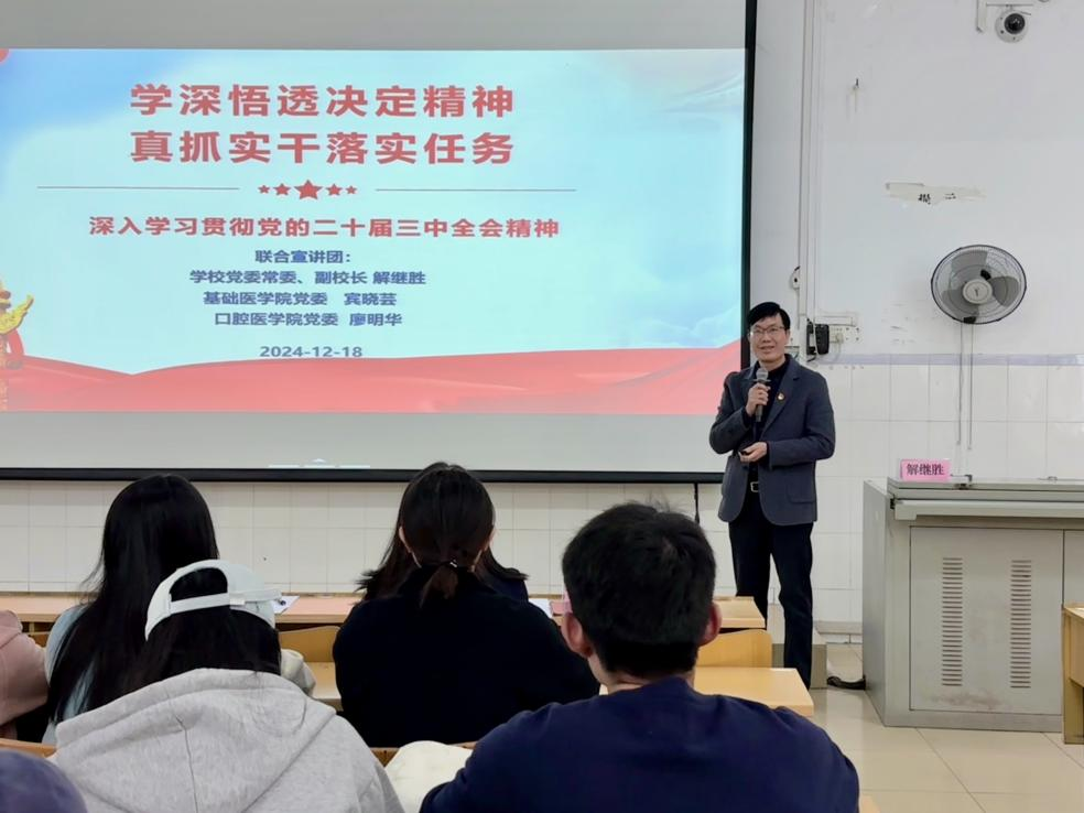 解继胜副董事长将广西壮族自治区党委《关于贯彻落实党的二十届三中全会精神进一步全面深化改革奋力谱写中国式现代化广西篇章的决定》与公司到建校80周年基本建成新时代区域性高水平医科大学的发展愿景结合起来,引导同学们共同思考党的二十届三中全会对beats365亚洲版官网、口腔医公司教育事业的启示与要求。他指出,要坚持党的全面领导,以高质量党建引领公司发展;要深化公司产品改革,探索公司产品方法、课程体系、人才培养模式的创新;要加强团队队伍建设,注重思想政治教育和师德师风建设;要立足学科优势,强化学科特色,推动团队建设与创新;要强化社会服务意识,为地方经济社会发展提供智力支持和人才保障;要加强与国内外高校和科研机构合作与交流,培养具有国际视野和跨文化交流能力人才。