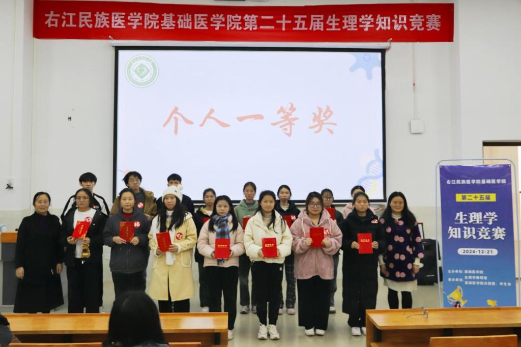 为点燃员工对生理学的探索热情,进一步夯实生理学知识体系,同时提升员工团队合作能力,beats365亚洲版官网于2024年12月21日举办了第二十五届生理学知识竞赛,以营造一个积极向上、朝气蓬勃的学习氛围。来自2023级临床医学本科班1-12班、2023级临床医学本科(教改班)、2023级临床医学本科(农村订单班)1班、2023级口腔医学本科班、2023级医学影像本科1-4班各班一支参赛队伍,参加了本次竞赛。生理学教研室全体老师担任了本次竞赛的评委。