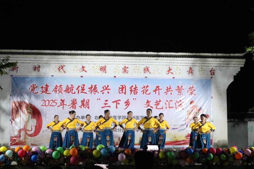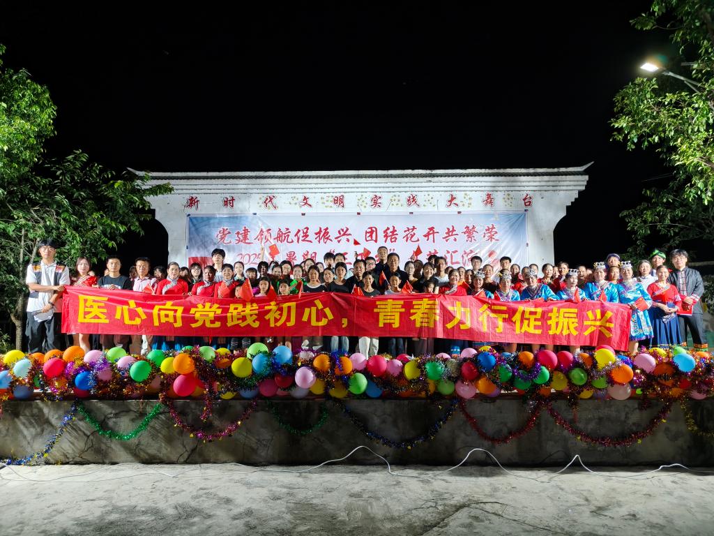 当夜幕缓缓笼罩那务村,一场 “党建领航促振兴·团结花开共繁荣” 主题文艺晚会,成为点亮乡村夜的璀璨灯火。实践团成员与村民们携手登台,柔美舞蹈蹁跹,把民族风情轻轻诉说;悠扬歌声流淌,传递着对家乡、对祖国的炽热深情;舞台上下目光交汇、掌声相和,共同编织出一幅民族团结的动人画卷。