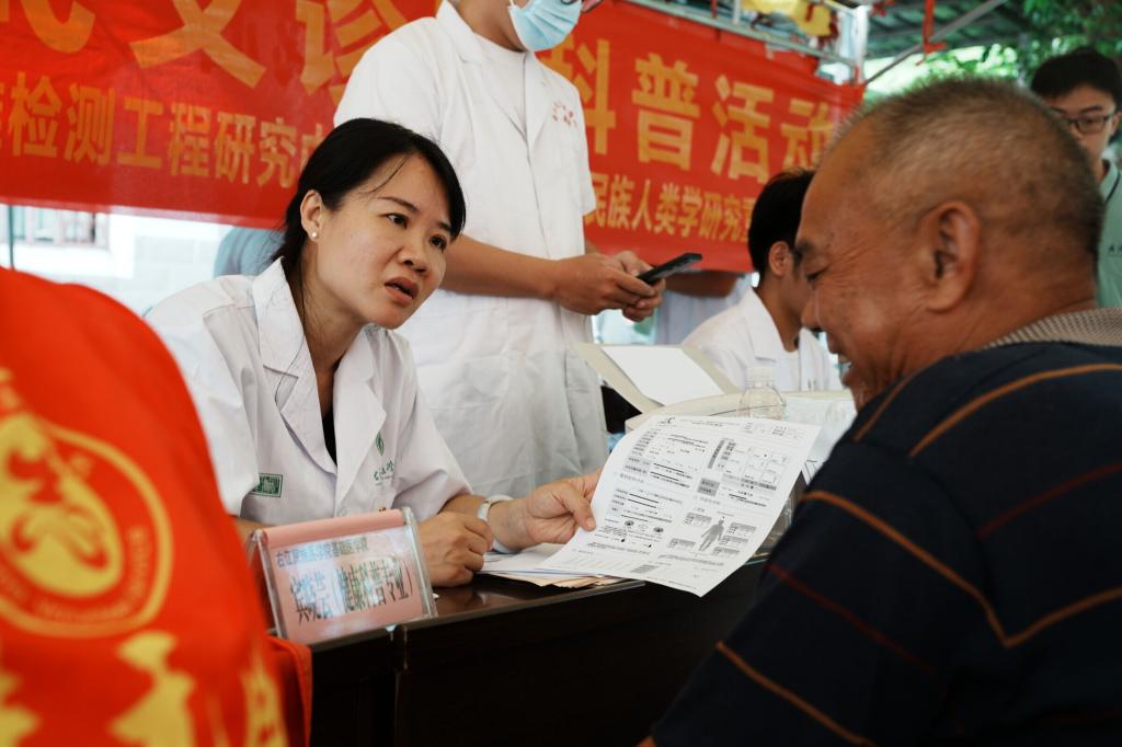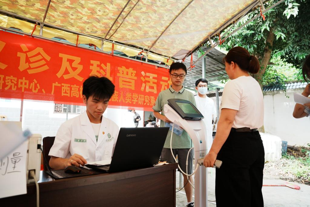 人类学科研团队为村民开展体成分检测、结果解释与健康宣教,并为村民科普合理膳食、科学运动、慢病预防、控重干预等内容,增强村民的健康意识和自我管理能力。一位村民感慨道:“平时去县城看病不方便,今天在家门口就有医生给我们免费看诊、教我们注意饮食和运动,真的很贴心。”