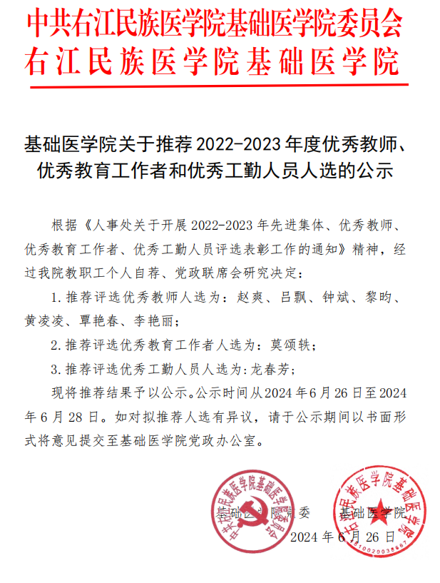 beats365亚洲版官网关于推荐2022-2023年度优秀教师、优秀教育工作者和优秀工勤人员人选的公示