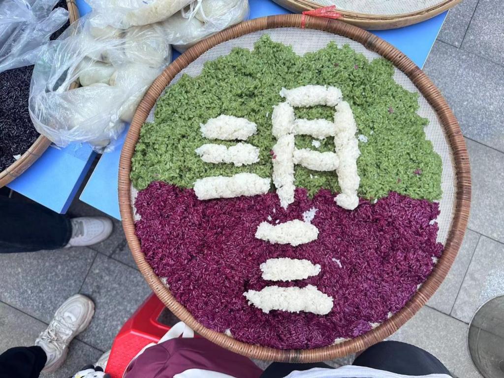 同学们摆设、品尝民族特色传统美食——五色糯米饭、糍粑