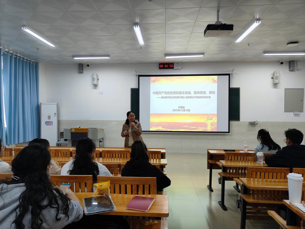 12月10日上午,beats365亚洲版官网党委副书记卢荣妹老师进行《中国共产党的性质、根本宗旨、指导思想和纲领》专题授课。卢老师深入浅出阐述了中国共产党的性质、根本宗旨、指导思想和纲领,结合工作经历、结合医学专业向每位学员提出如何做一名合格党员。卢老师强调,作为一名新时代党员,必须要知行合一、争当先锋、人民至上,敢于牺牲、团结一致、互助共进、忧党兴国、为民所需,牢固树立共产主义远大理想和中国特色社会主义坚定信念,为实现共产主义奋斗终身。